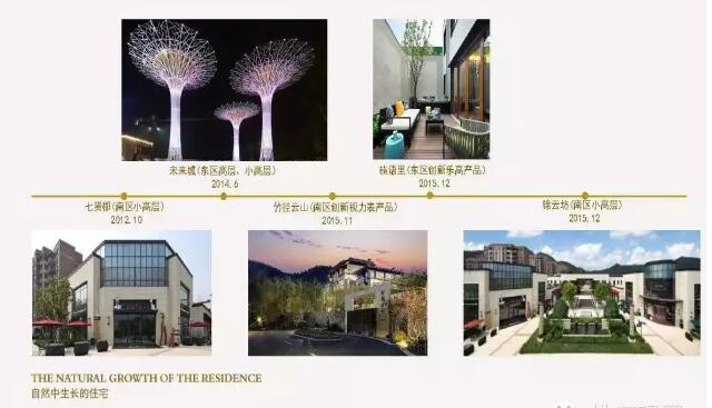 簡(jiǎn)單說(shuō)完商業(yè)的發(fā)展狀況,來(lái)說(shuō)下項目開(kāi)發(fā)的時(shí)間安排。最早的是04年白鷺郡北,這也是處于比較保守的考慮,一開(kāi)始就把最優(yōu)質(zhì)的沿山坡地資源開(kāi)發(fā)出來(lái),希望市場(chǎng)可以更早地認知到土地的價(jià)值和珍貴。之后面世的組團是竹徑茶語(yǔ),當時(shí)我們有一個(gè)口號是說(shuō)“茶園山林間的山地住宅”,整個(gè)面世的時(shí)間大概在2006年,現在良渚的宣傳資料也依然會(huì )用到一些竹徑茶語(yǔ)的形象。