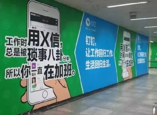 今年4月,在離騰訊大廈最近的深大地鐵站,竟然出現了競爭對手阿里釘釘的廣告。以上頗具挑釁的廣告文案雖然沒(méi)有點(diǎn)名但赤裸裸的“X信”,明眼人一看便知說(shuō)的是微信?!鞍l(fā)X信給老板,總是分不清他是沒(méi)看到,還是假裝沒(méi)看見(jiàn),所以你一直在加班?!?、“用X信來(lái)開(kāi)會(huì ),時(shí)間總是被浪費,所以你一直在加班?!薄搬斸?,讓工作回歸工作,生活回歸生活”……
